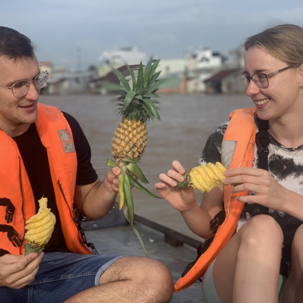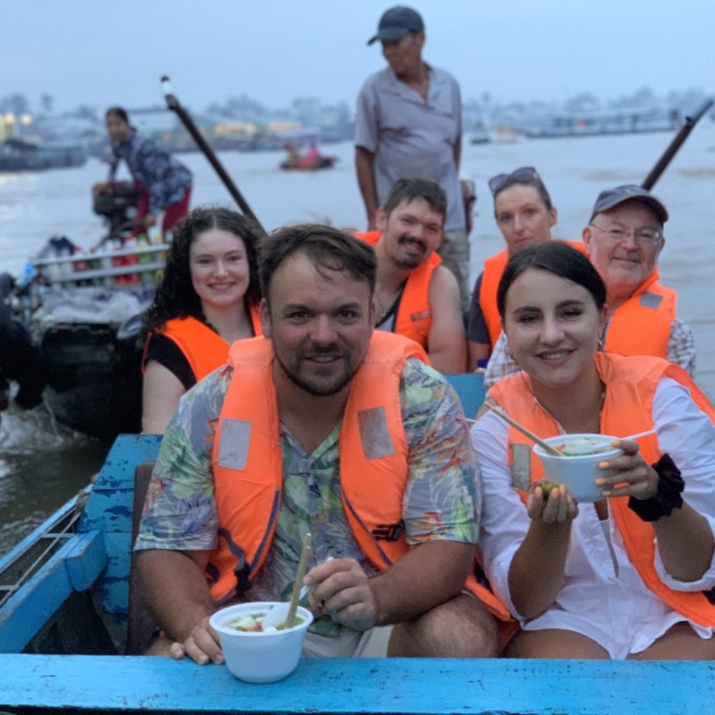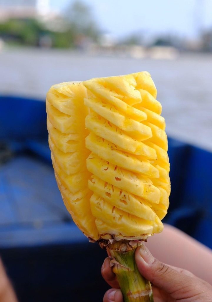 Have breakfast on the boat with “Shaking Rice Noodle Soup: Hủ tiếu”, drink tasty Vietnamese Coffee, and taste some Vietnamese traditional fork Cake and the freshest pineapple on the floating boat!